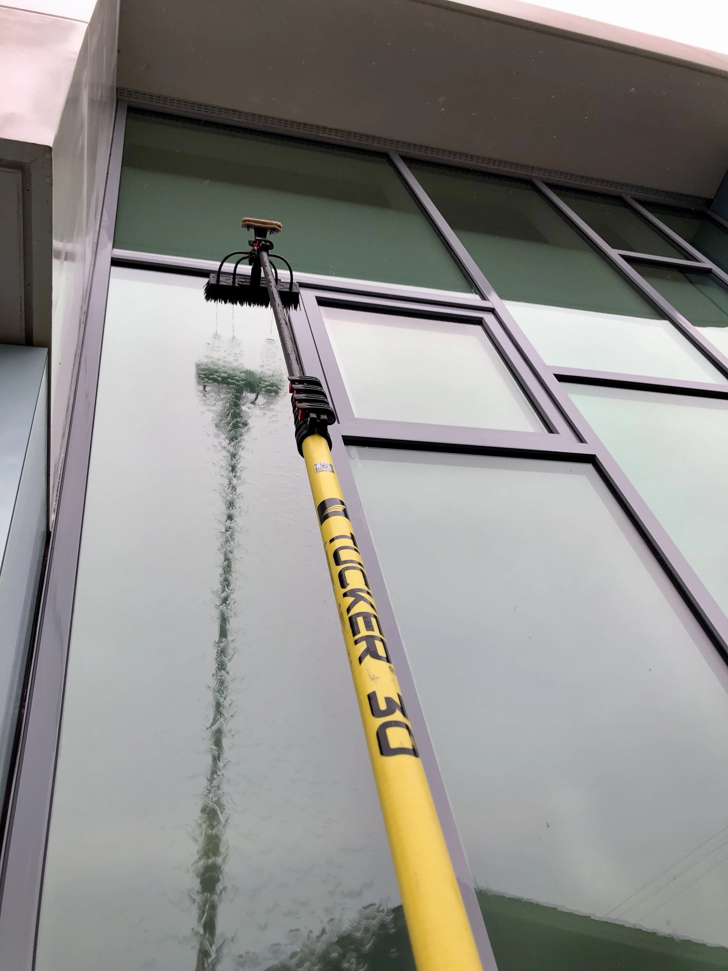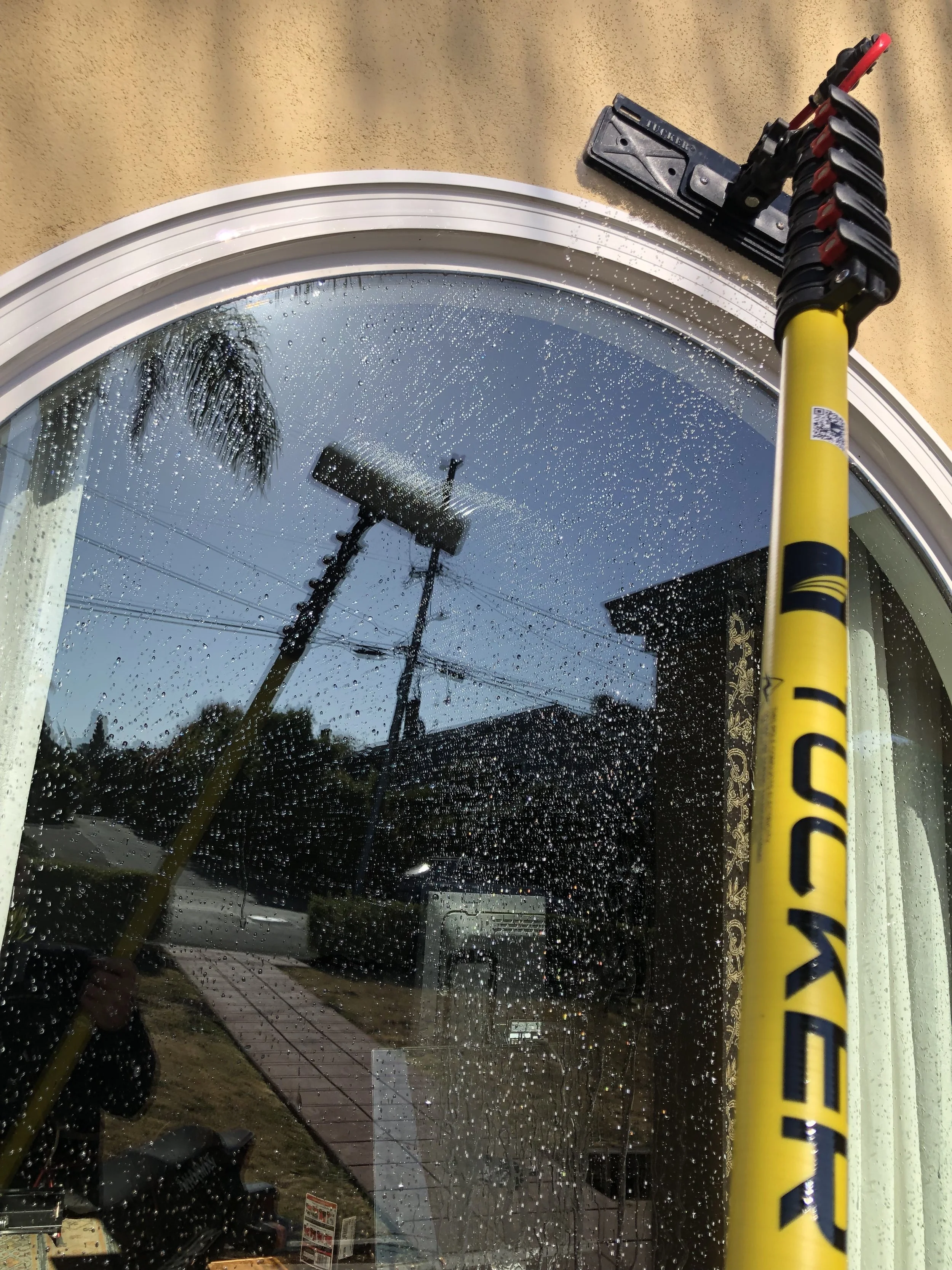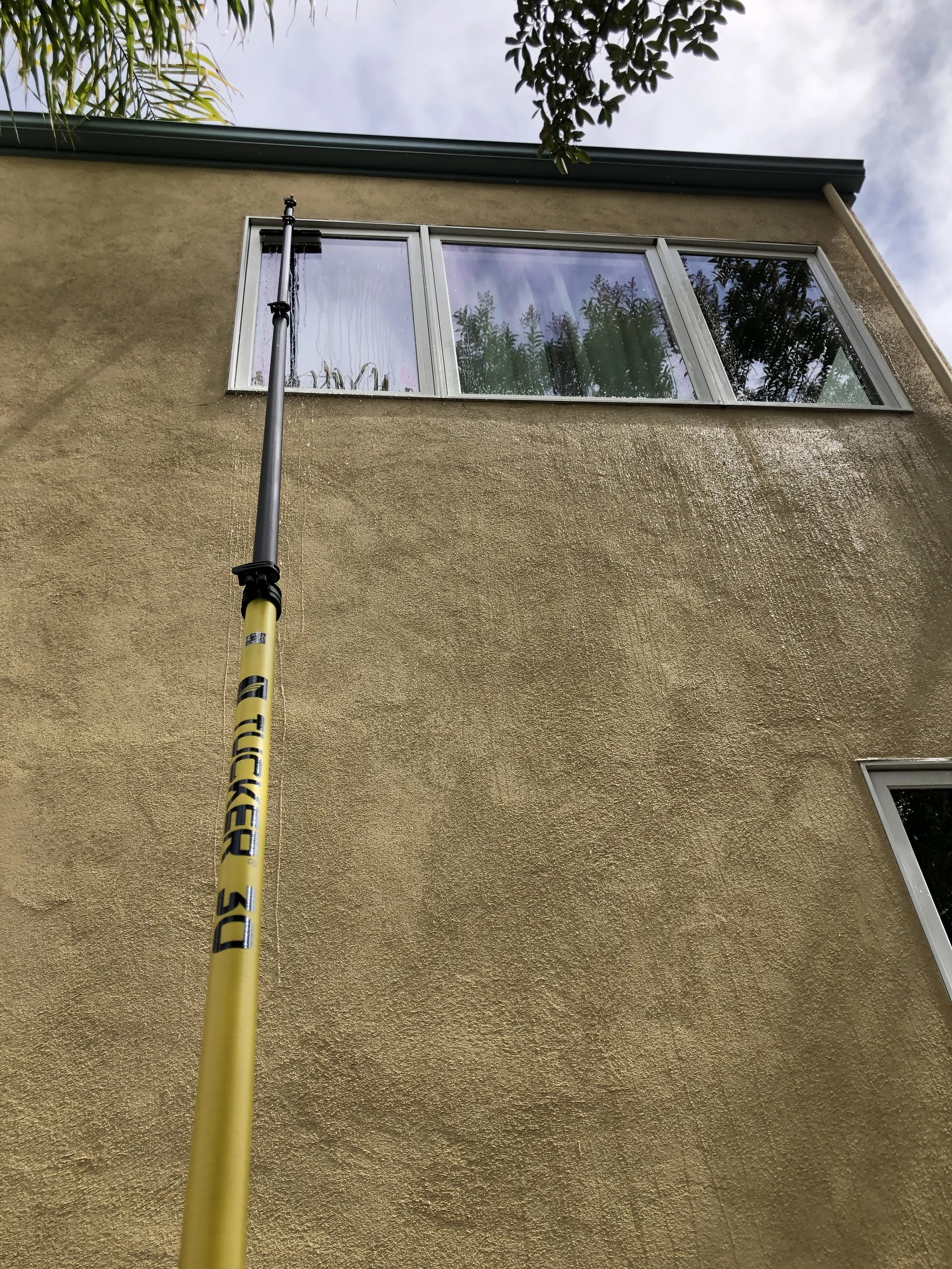 The water fed pole system that I use involves a 3 stage filter which you can see in the above photo. The water first passes through a carbon filter to catch any chlorine and rust. It then passes through a reverse osmosis filter which is in the long cylindrical steel case body. Lastly, the water is filtered through a De-Ionization resin membrane. Why is this important? Tap water can be quite hard with many hard minerals inside. Currently the water in this area reads around 220ppm Total Dissolved Solids. This 3 stage filter swiftly and efficiently filters all of the minerals out of the water before touching your glass for cleaning. I am able to have a Total Dissolved Solids reading of 001ppm after passing the water through my filter. It cleans the glass exceptionally well and dries completely spotless for a crystal clear view. There is no concern of minerals hardening on your glass to create issues with etching. The carbon fiber pole in which the hose runs through reaches up to 30 feet high so that I may clean your home or business in a safe and effective manner. Investing in this technology has given me the tools to tackle any job and provide the best service possible. I truly take pride in my work and love seeing a smile on people’s faces when I’m finished.